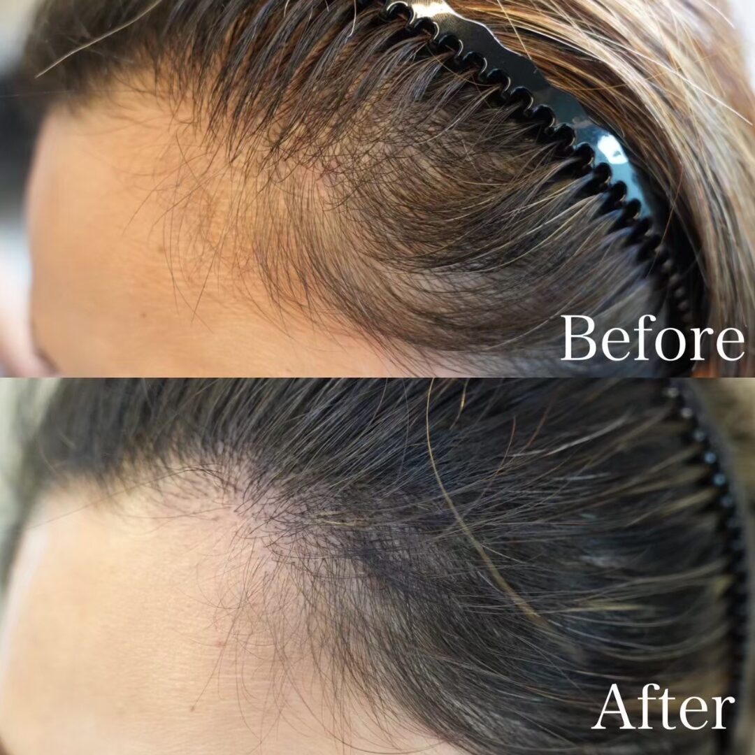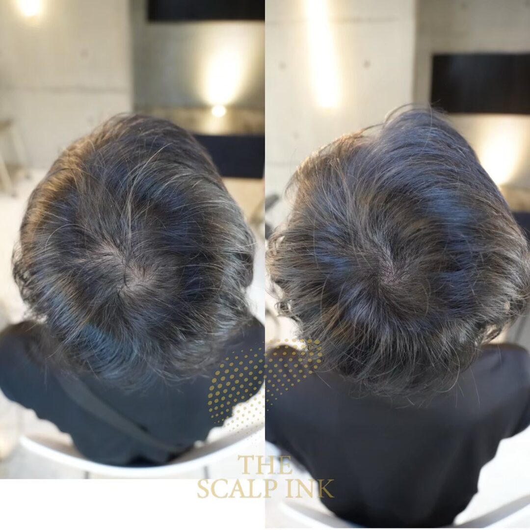 白髪の方やカラーをしている方にも綺麗に馴染ませることができます。微細なインク濃度設定と陰影を駆使することで、自然な仕上がりを可能にしています。