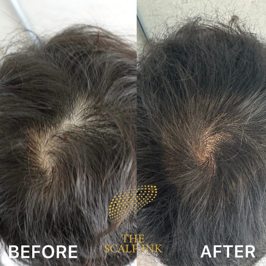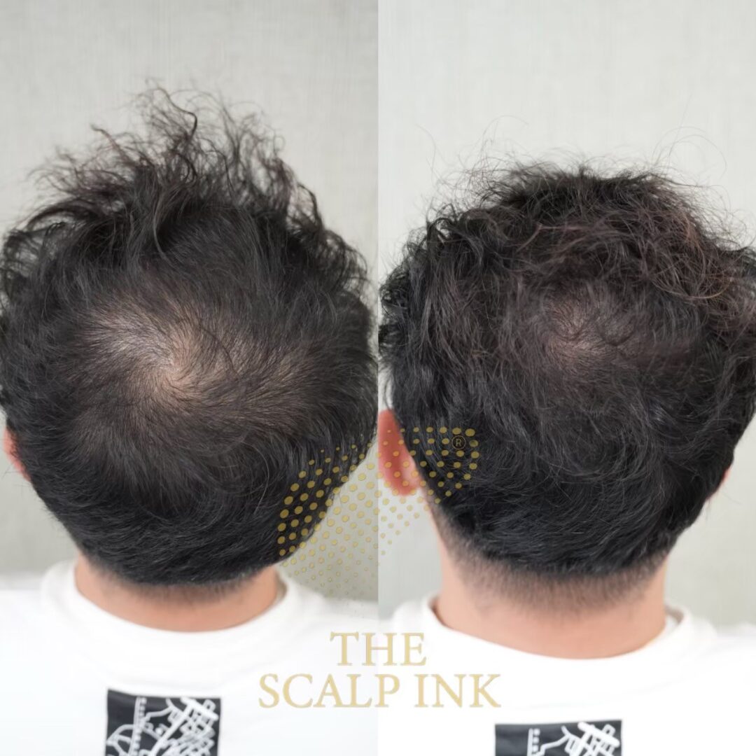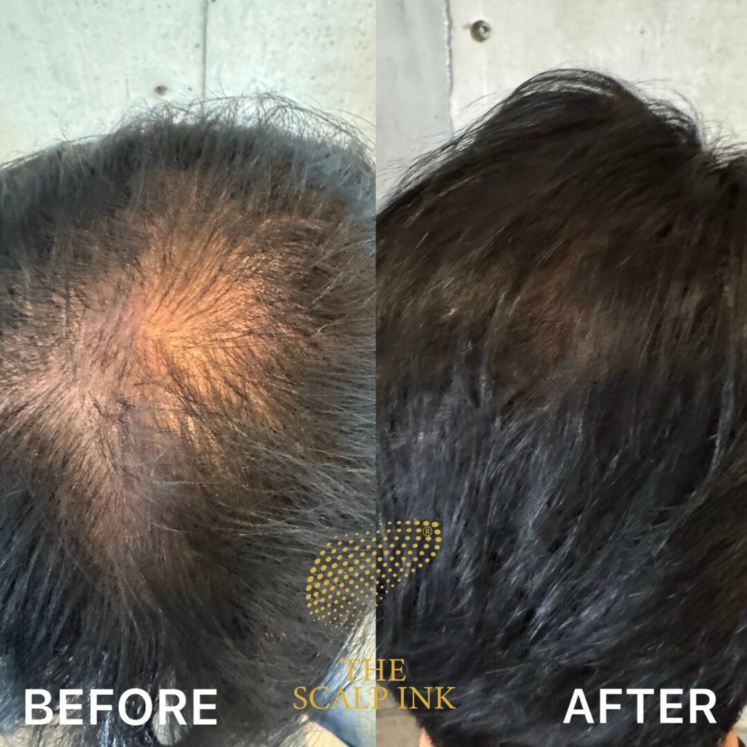 スカルプインクは、オリジナルの特殊なインクを使用して毛髪と同じサイズの美しいドットを描いていきます。髪を増やすのではなく、視覚的に“生えているように見せる”最新技術。AGA治療や植毛とは異なり、短時間・低負担で自然な見た目を手に入れられるのが特長です。